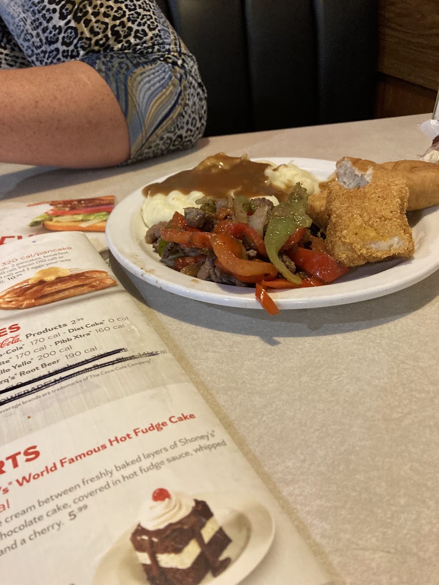 Steak tips seasoned with Shoney’s steak seasoning, sauteed broccoli, bell peppers, sweet onions, and mushrooms all tossed in savory bourbon sauce and then served over steamed rice. Includes a house salad.